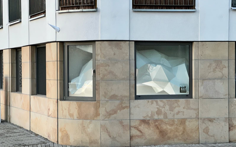 For this exhibition niche, which is far more than an ordinary shop window, Matthias Lehmann has developed an arrangement of folded paper, bound to the location, which deals with its limitations, absurdity and presence and playfully traces its peculiarities between inside and outside, separation and permeation.