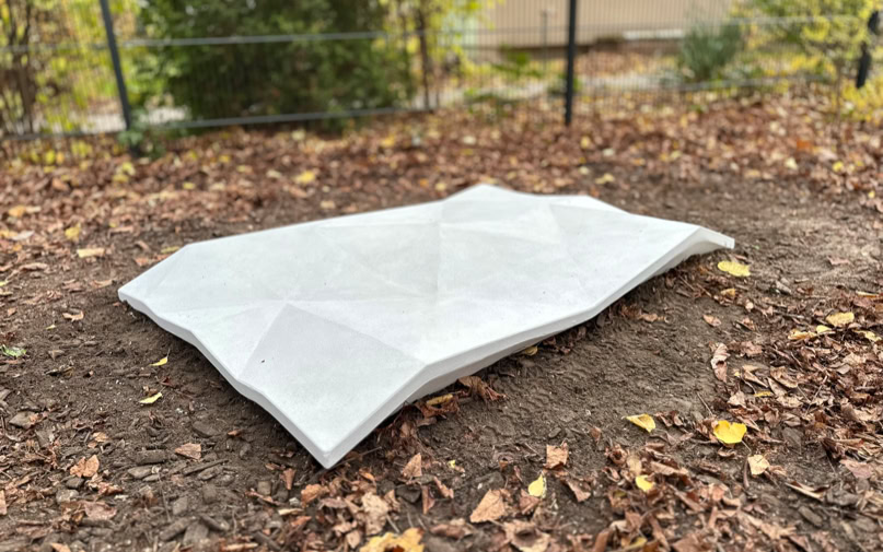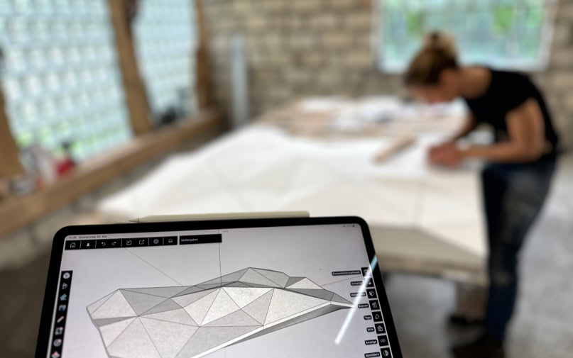 Three folded figures made of paper: a (soap) box, a boat and a plane, which are analogous to movement or transportation possibilities on land, on water and in the air, are unfolded and leave folding patterns on the sheet, which give clues about their original form and shape. This transformation from the two-dimensionality of the surface of a sheet of paper to a spatial object with its specific properties (moving/transporting, floating and flying) and back again provides an insight into the changeability of the things that surround us.