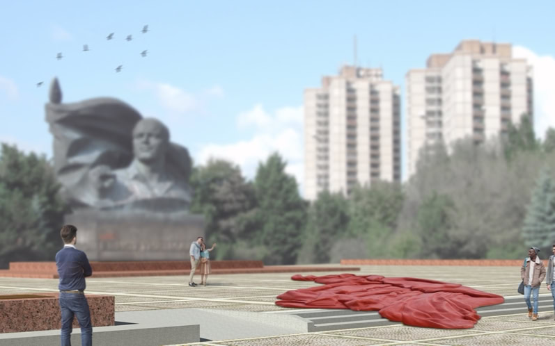 FALLEN FLAG picks up on this symbol and places the folds of a fallen oversized red flag diagonally on the forecourt of the monument. With the fall of this central symbol of GDR and Eastern Bloc history, the artistic commentary addresses the decline of the socialist social order, whose contemporary testimonies - manifested in the appearance of the historical square ensemble - are covered, partially disappearing and thus appear less tangible and present for us , as if under the veil of a bygone age.