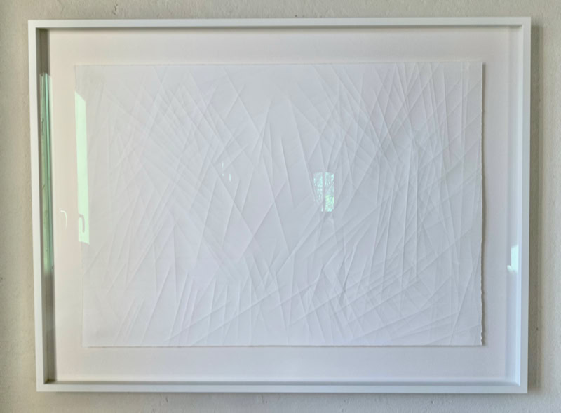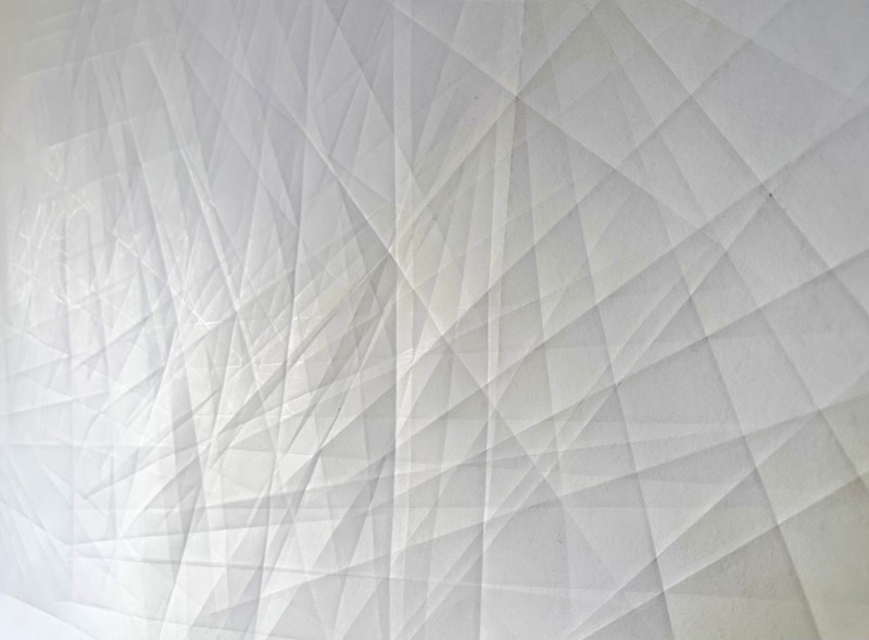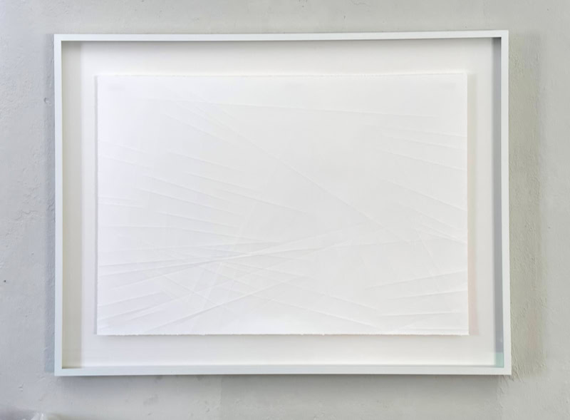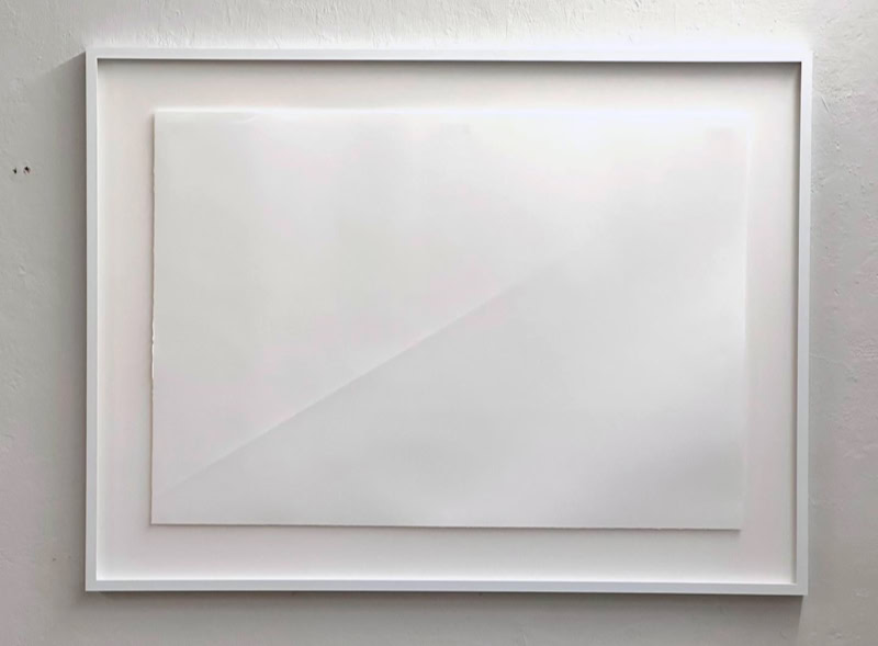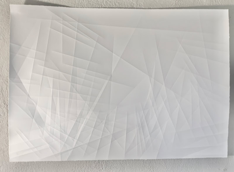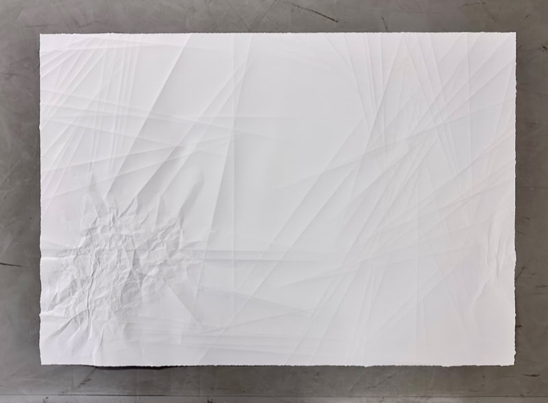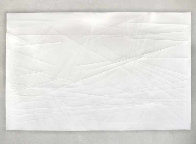 With the first fold of a sheet, the paper immediately and irreversibly intervenes in space: it becomes three-dimensional. Overlapping breaks in the paper change the inclinations of the surfaces in relation to each other and allow the light to refract on each edge. Depending on the daylight, its appearance changes to the extent that the vertical, diagonal or horizontal lines and breaks appear more clearly.