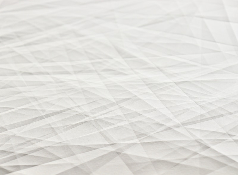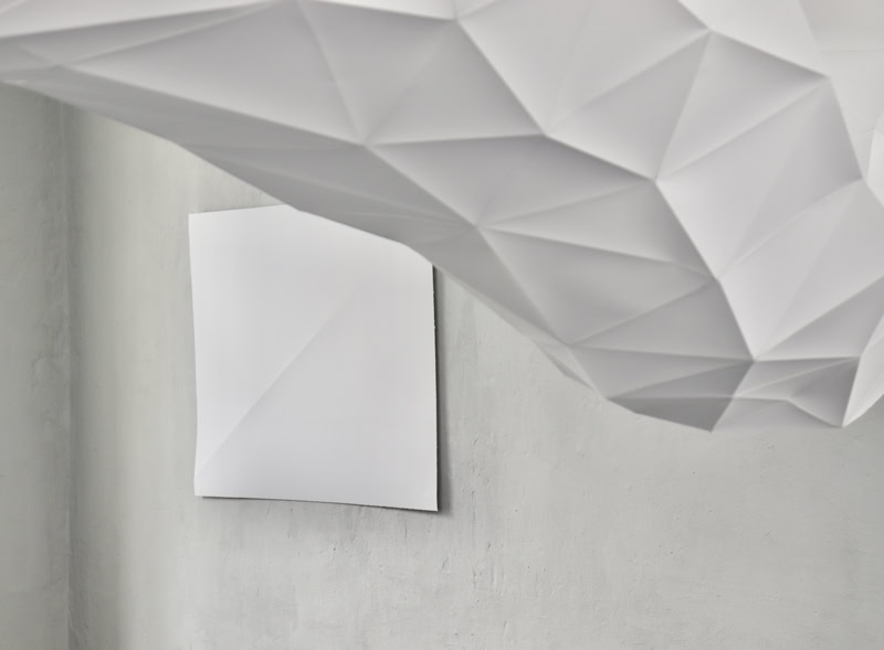 Mit der ersten Faltung eines Blattes greift das Papier sofort und unumkehrbar in den Raum ein: Es wird dreidimensional. Sich überschneidende Brüche im Papier verändern die Neigungen der Oberflächen zueinander und lassen das Licht an jeder Kante brechen. In Abhängigkeit zur Tagesbeleuchtung verändert sich das Erscheinungsbild in dem Maße, dass einmal mehr die vertikalen, diagonalen oder horizontalen Linien und Brüche in Erscheinung treten. |
