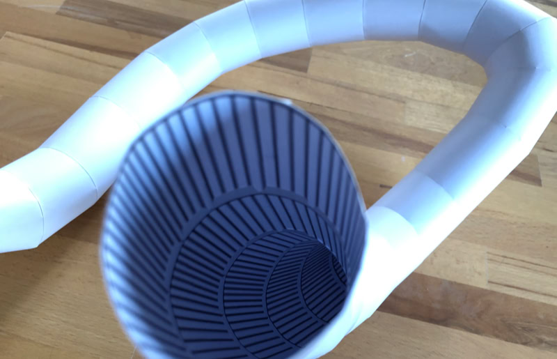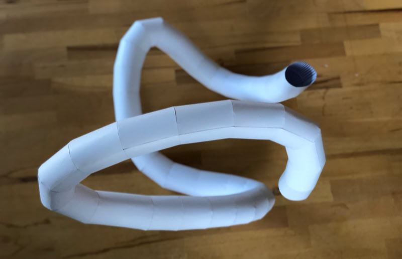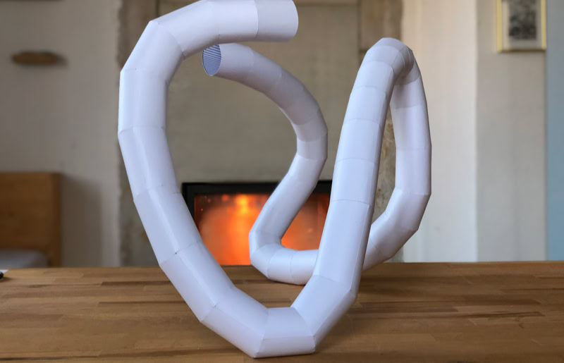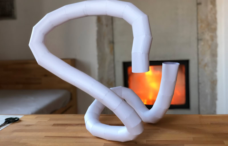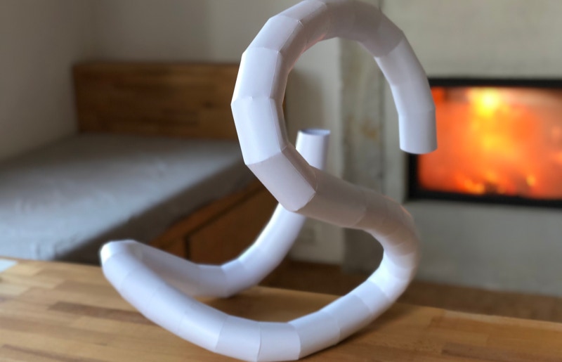 fast stands for the discrepancy between virtual and actual reality. A self-contained snake-shaped object, which was designed with a 3D programme and whose development served as a pattern for the production of the paper sculpture, contains deviations and inaccuracies after its realisation, resulting in the fact that the two ends of the paper snake do not unite into an endless loop, as in the original virtual model. Thus, the two ends of the sculpture only "almost" meet. In the interior of the sculpture, one sees the underlying and printed development of the space-occupying object.
