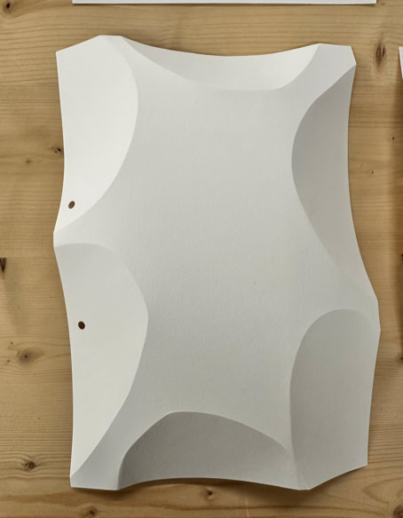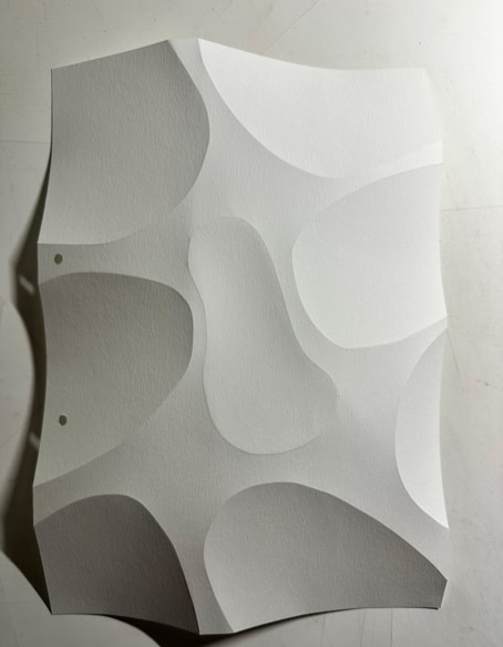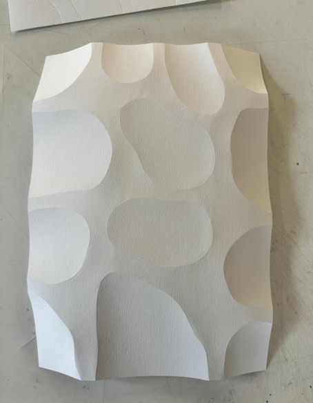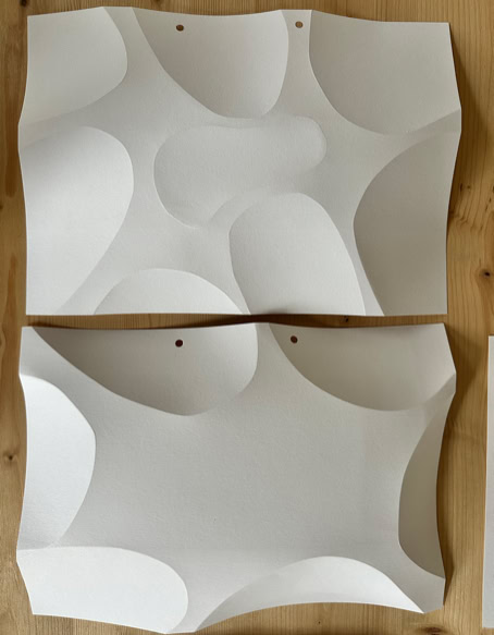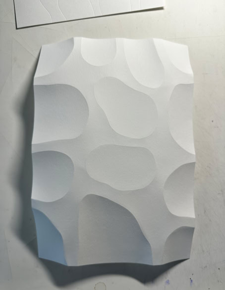 FOLDERBUBBLE ist eine papierbasierte Reliefarbeit, in der durch präzise Faltungen eine modulare Oberflächenstruktur entsteht. Die seriell angelegten, weich gerundeten Erhebungen strukturieren die Fläche und erzeugen eine subtile räumliche Tiefe, die wesentlich durch Licht- und Schattenwirkung bestimmt wird. Innerhalb des fortlaufend erweiterten Archivs der Faltungen dokumentiert die Arbeit systematische Untersuchung von Papier als Medium zwischen Fläche, Relief und Raum. |