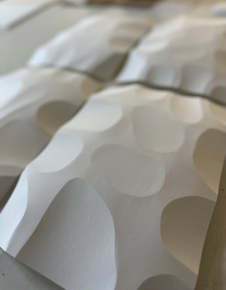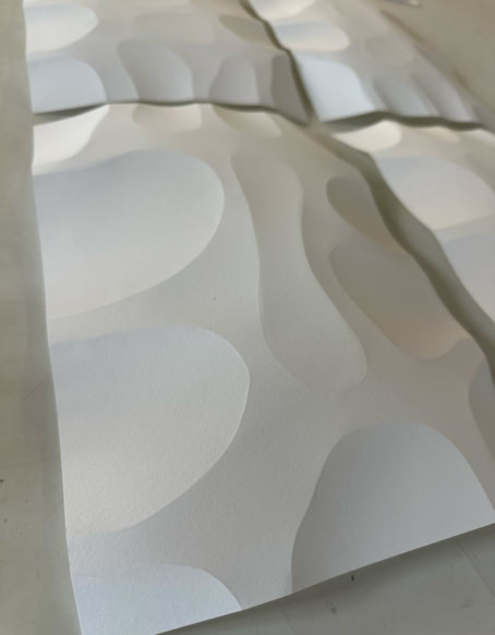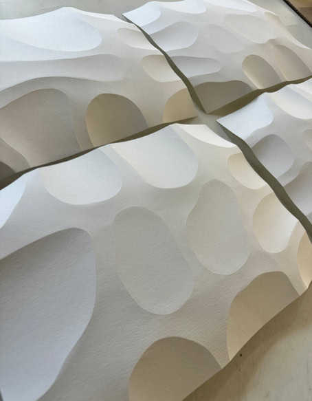 FOLDERBUBBLE is a paper-based relief work in which precise folds create a modular surface structure. The serially arranged, softly rounded elevations structure the surface and create a subtle spatial depth that is largely determined by the effects of light and shadow. Within the continuously expanding archive of folds, the work documents systematic investigation of paper as a medium between surface, relief, and space.