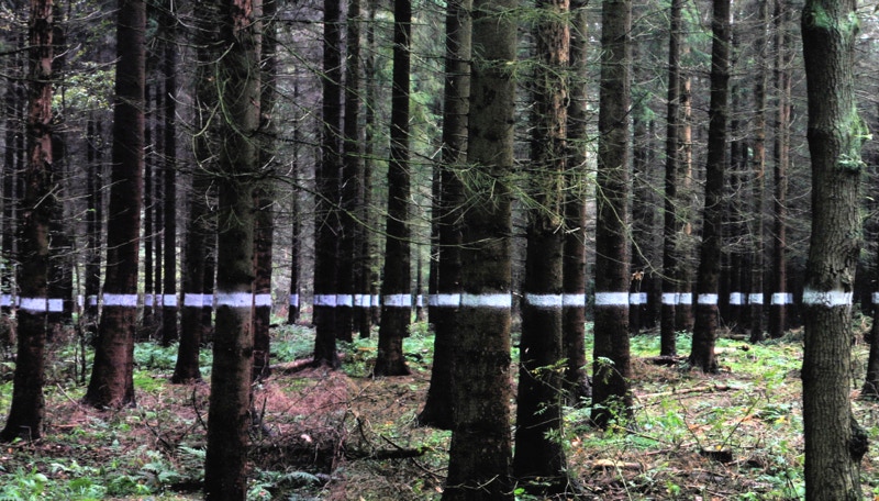 Matthias Lehmann wählt sich den Mittelpunkt seines Wegabschnittes und markiert diesen mit einer Betonplatte, auf der die genauen Längen- und Breitengradangaben sowie die Höhe dieses geographischen Punktes zu lesen sind. Diese Angaben stammen von dem zuvor ermittelten kongruenten Standpunkt bei Google Earth, von welchem er die virtuelle Horizontlinie der 3D-Google-Earht-Oberfläche nimmt und auf den realen Standort in Poggenhagen projiziert. Die Projektion dieser Horizontlinie wird mit weißer Farbe auf die Baumstämme des umgebenden Waldes gemalt. Sie ist nur von dem einen exakten geographischen Punkt aus sichtbar und verschwimmt immer mehr zu einem chaotischen Strichmuster, je weiter man sich davon entfernt.