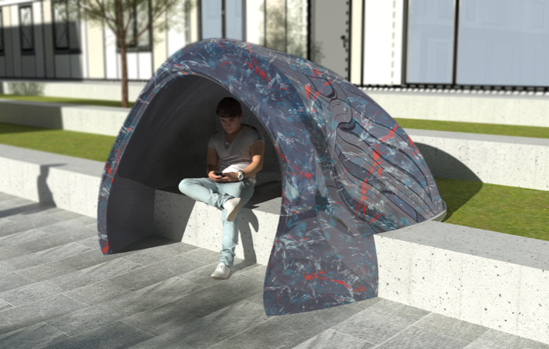Der Entwurf für die sieht die Herstellung dreier, an die Umgebung angepasster, blasenförmiger Hohlkörper aus mehrfarbigem poliertem Epoxidharz vor, welche sich mit ihren konvex gewölbten Formen über Teilbereiche der geplanten Möblierung des Außenraumes legen. Dabei werden bestehende Sitzgelegenheiten integriert und als konzeptioneller Bestandteil der Kunst am Bau genutzt. So bilden die Schutzblasen begehbare Innenräume, die sich über eine Öffnung betreten lassen. Jede der drei Blasen umschließt oder überwölbt einen Teil der geplanten Sitzmöbel und lädt dazu ein, sich niederzusetzen und den umgebenden Raum auf sich wirken zu lassen.