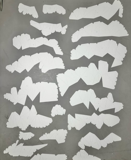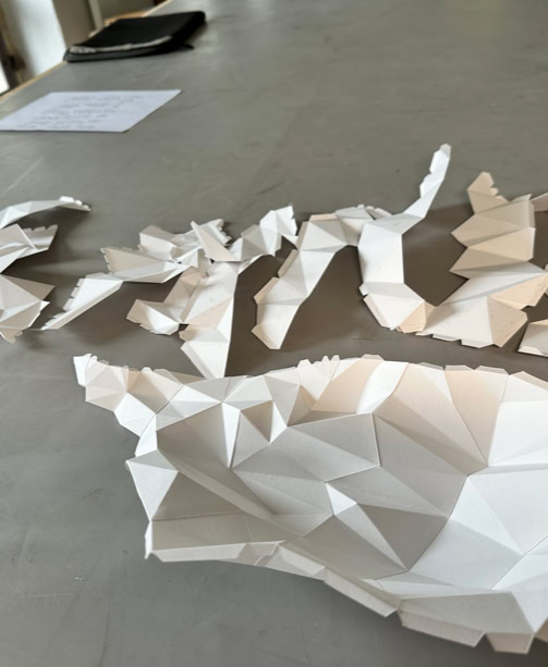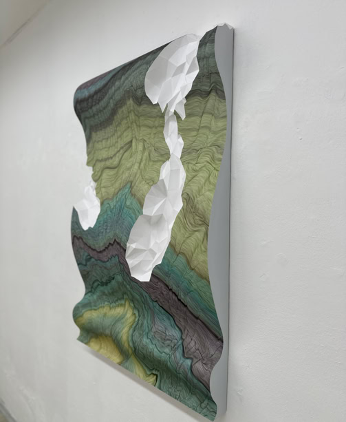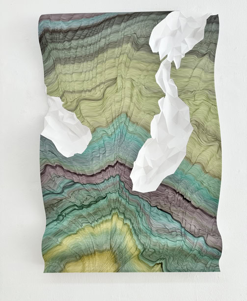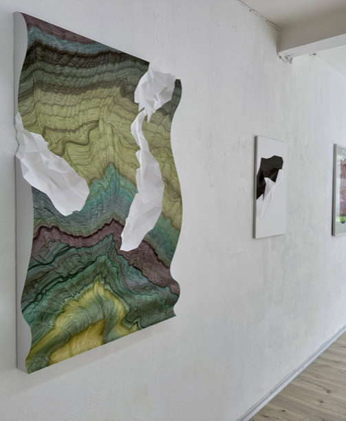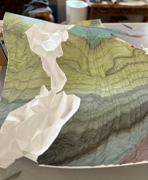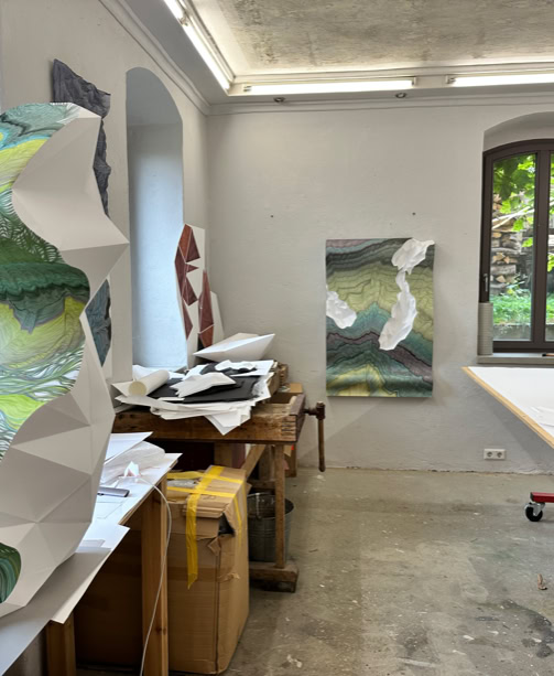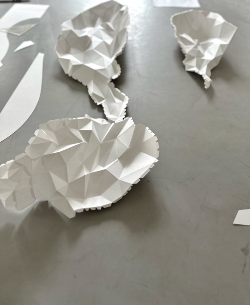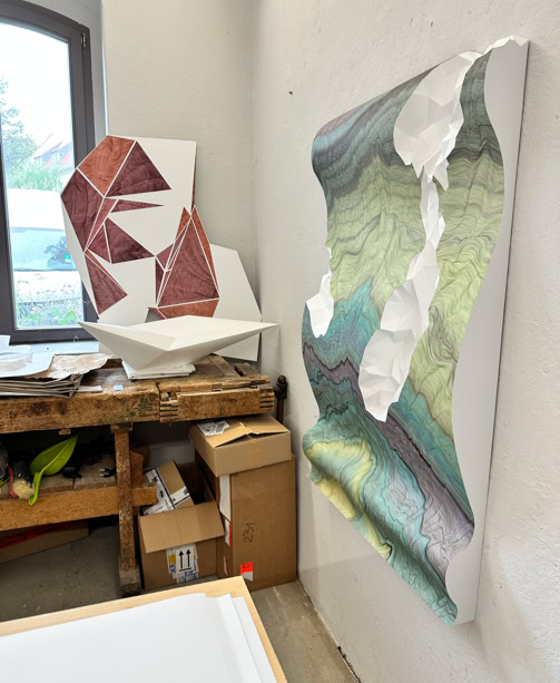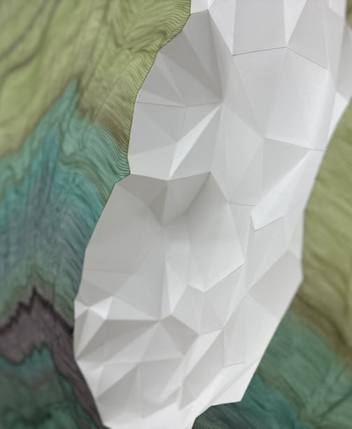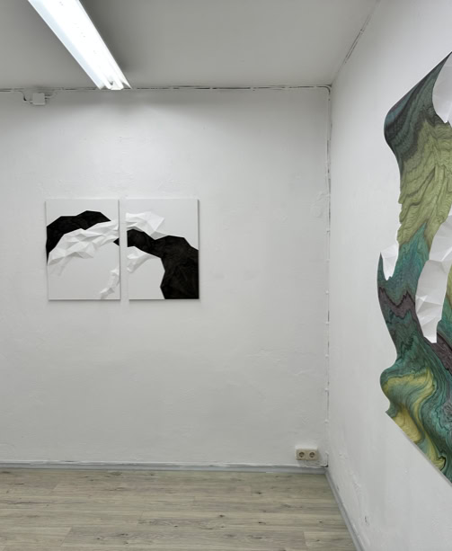 MINE MAP takes up earlier works by Lisa Pahlke, in which her illusionistic spatial ink drawings on sheets of paper curve into the room. This form of a curved sheet of paper is now permeated by a crystalline, geometric triangular structure. In their interplay, the two forms not only look like a mind map reflecting the joint creative process, but also like a mine map depicting rock structures and crystalline mountain veins.