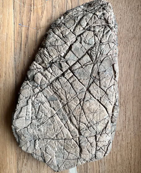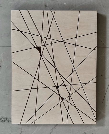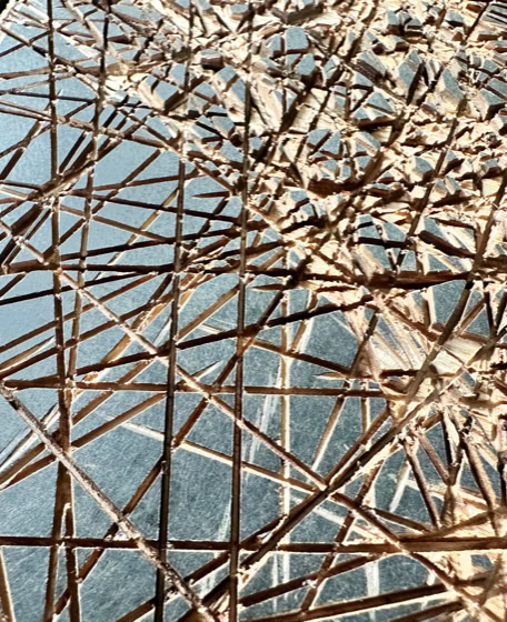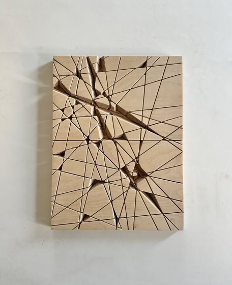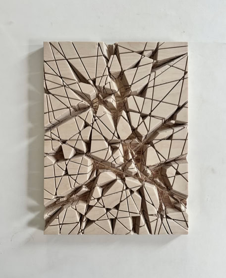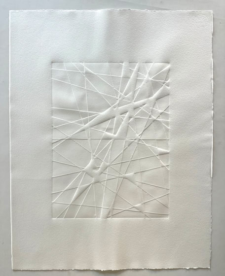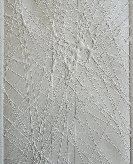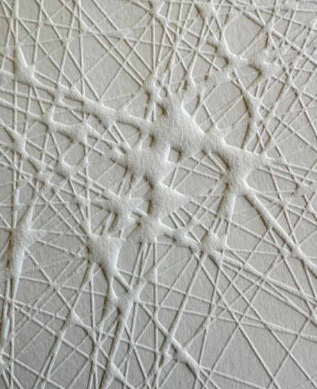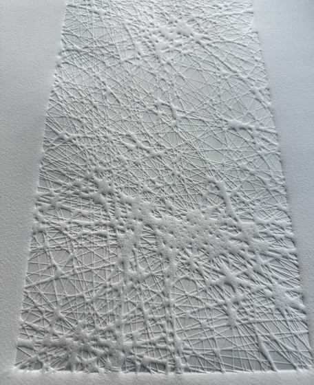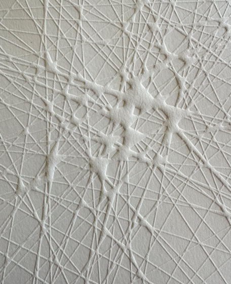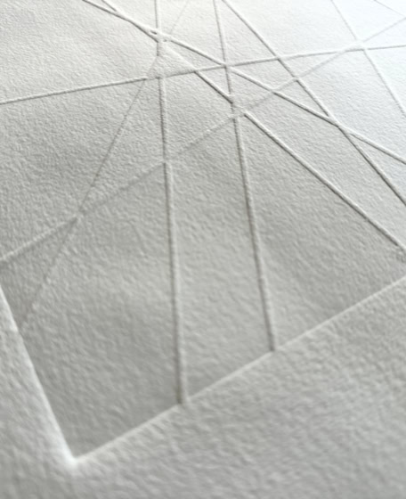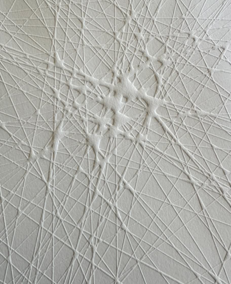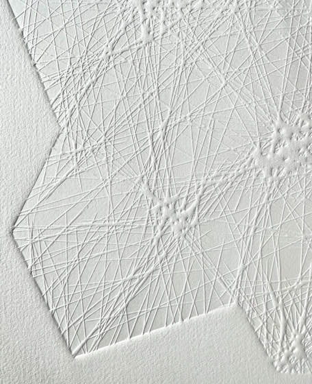 Mit hoher Druckkraft und ohne den Einsatz von Farbe in das Papier geprägt, entfaltet die Arbeit allein durch Licht und Schatten ihre räumliche Wirkung. Sie betont die sensible Dreidimensionalität des Materials und macht zugleich verborgene Ordnungen innerhalb des Fasergefüges sichtbar. PRÄGUNG ist eine abstrakte Kartografie von Informationsflüssen, Wachstumsprozessen und energetischen Verbindungen – und verweist auf universelle Prinzipien von Struktur, Kommunikation und Vernetzung in Natur und Technik. |