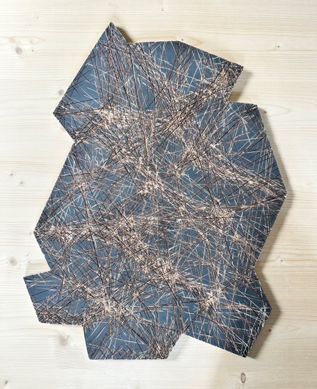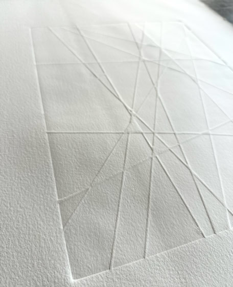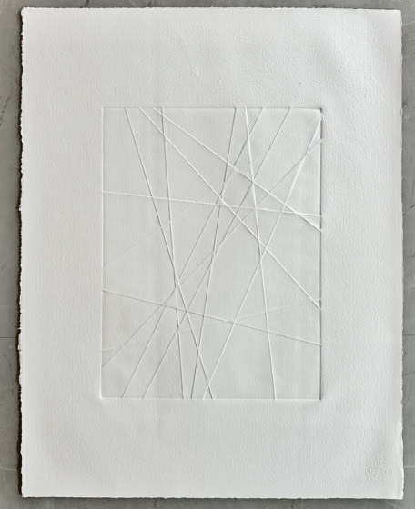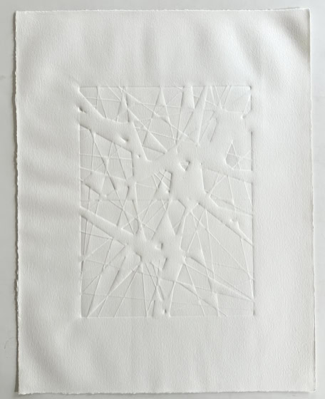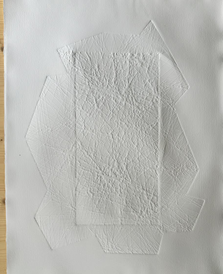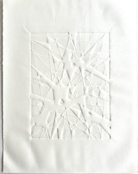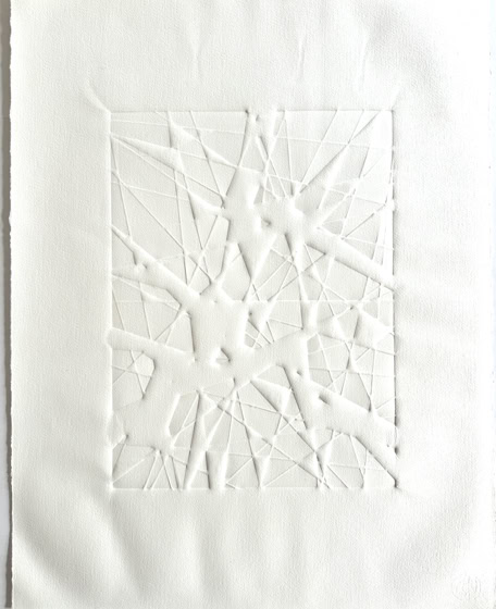 Diese Papierprägungen entstehen aus schrittweise weiterbearbeiteten Prägeplatten, deren glatte Oberfläche durch wiederholtes Einschneiden zunehmend verletzt wurde. Die entstandenen Schnittstellen verdichten sich zu gemeinsamen Ballungszentren.