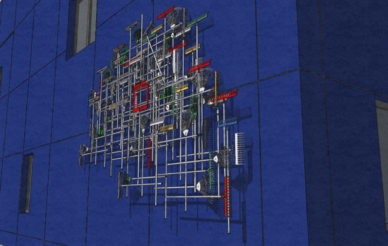 Countless metal gardening tools of different shapes and colors form a branched network that gathers around a center. This consists of 4 rakes turned at a 90° angle to each other and thus forming a square, which in this special arrangement is reminiscent of the structure of a processor - the heart of every computer. In this way, a humorous link to the building's purpose is created in a wondrous way, both visually and linguistically via the homonym.
