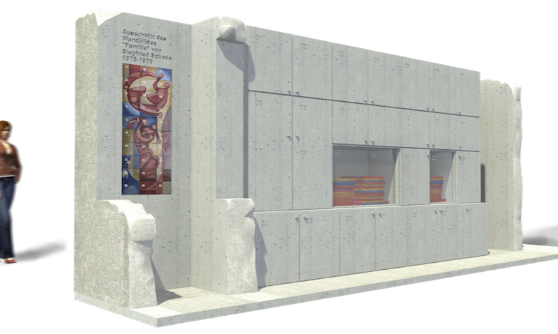 Zwei benachbarte Platten, die in Ihrem Zustand am besten erhalten sind, sollen dafür im Original bestehen bleiben und gefestig, bzw. konserviert werden. Alle anderen 28 Tafeln werden von Ihren Trägerplatten abgelöst, nach einer Kartierung in Einzelsegmente zerlegt und am selben Ort auf der Rückseite der zwei Originalplatten, innerhalb einer nachgebauten 70er Jahre DDR-Schrankwand eingelagert.