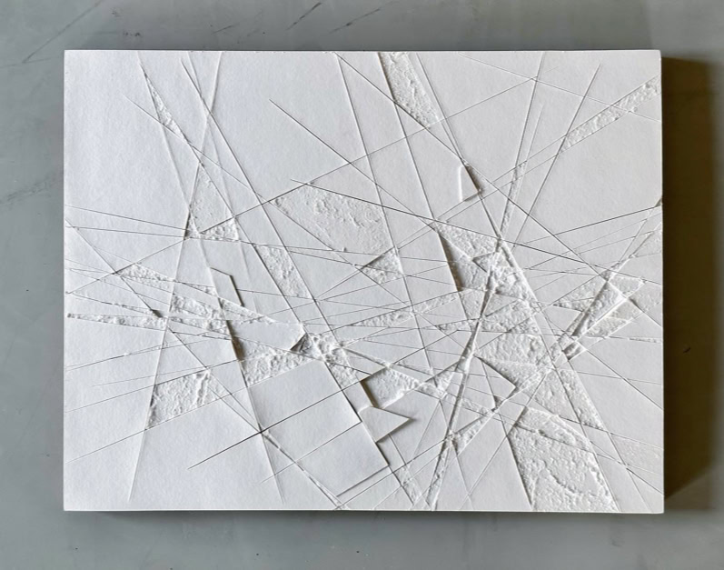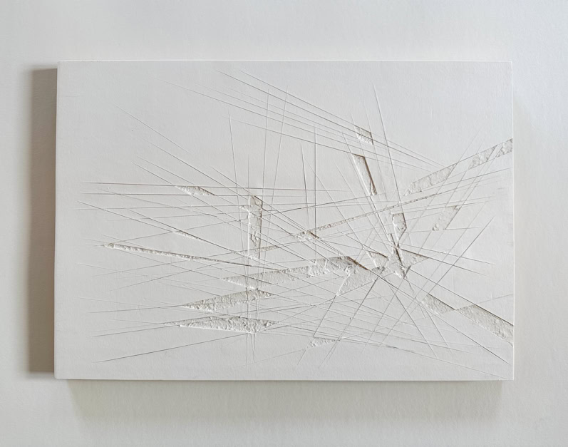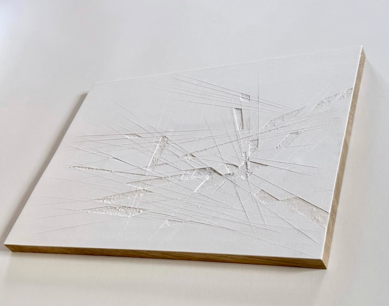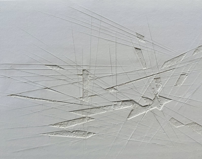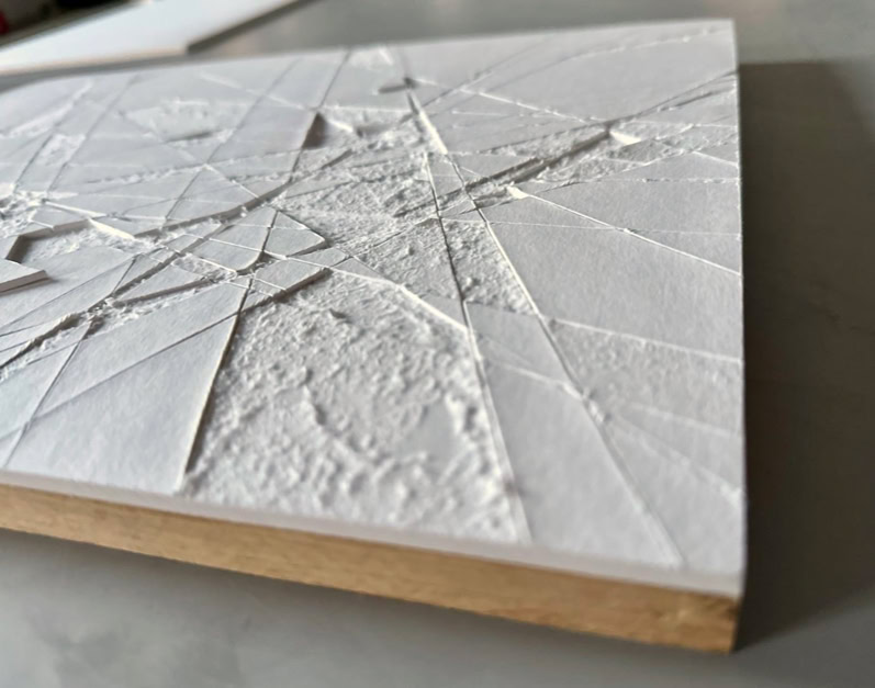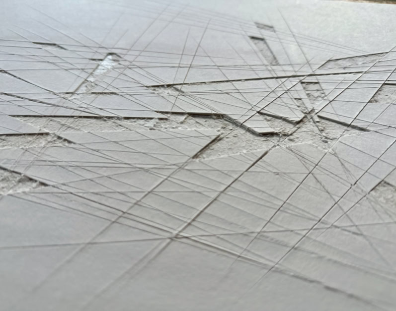 When cutting out patterns with a ruler and utility knife, unwanted lines and shapes often appear unintentionally on the cutting mat or other surfaces, spatially dividing over several levels and depths, dissecting, merging into various geometric shapes and then disappear again. The disintegration of several layers of paper laminated on top of each other and the visualisation of the spatial layers lying beneath, through the partial extraction and rearrangement of certain areas, is comparable to miniature mining.