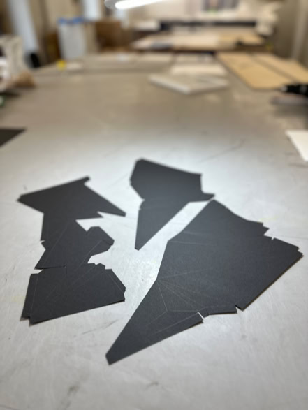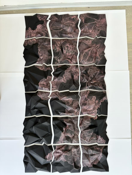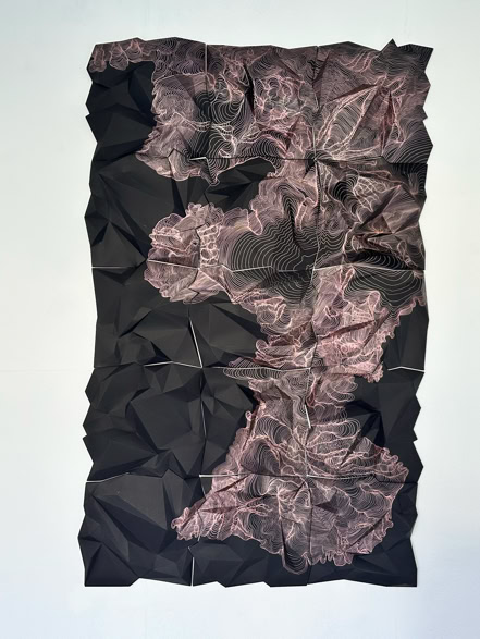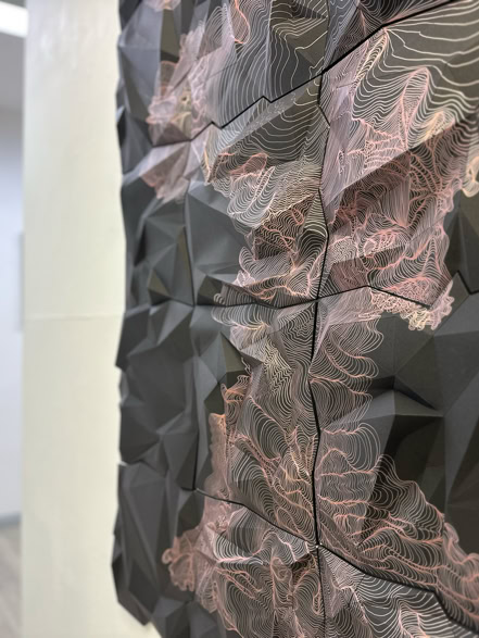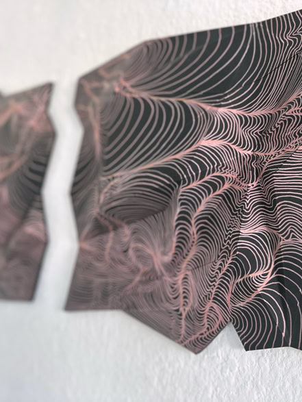 Die serielle Arbeit SPIN betrachtet räumlichen Wahrnehmungsmuster. Höhen und Tiefen, Innen und Außen werden unterschiedlich bewertet, hervorgehoben und akzentuiert. Dabei verschieben sich die Grenzen zwischen dem, was real und illusionistisch ist und der Glaube an das Absolute des gesehenen Bildes. SPIN II ist eine Weiterentwicklung des Vorgängers ausschließlich aus schwarzem Papier, dessen Umrisse immer zum benachbarten Feld passen und sich endlos in einer Fläche fortführen lassen. |