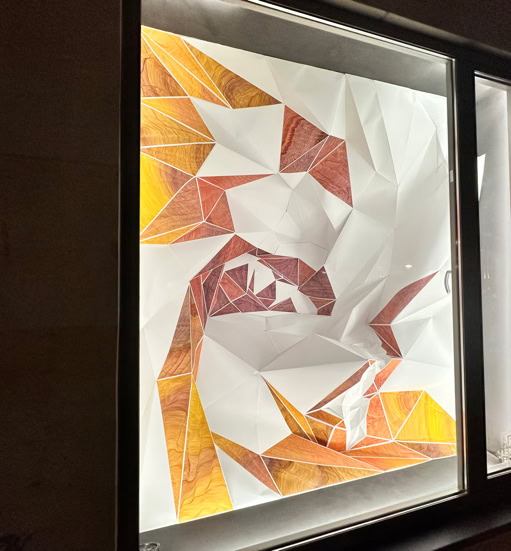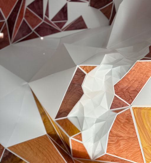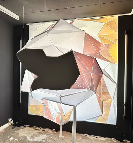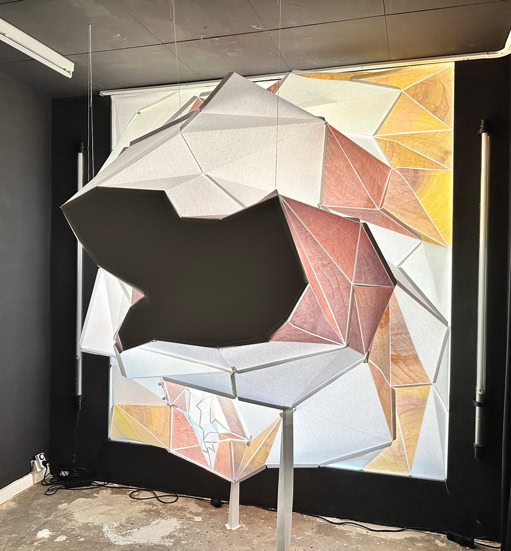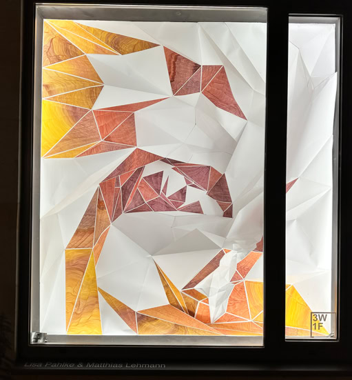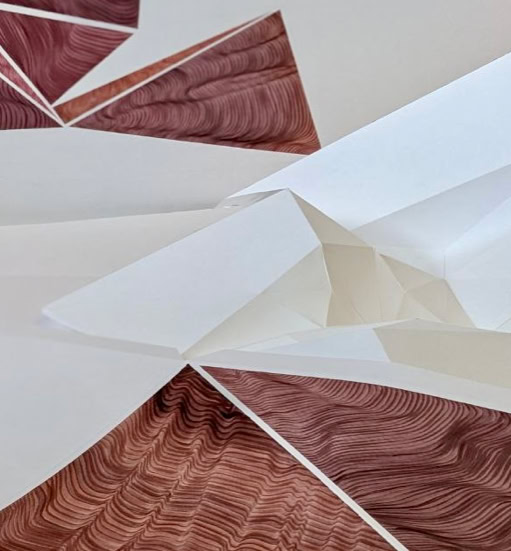 Eine für den Projektraum 3W1F entwickelte von außen über das Schaufenster wahrzunehmende skulpturale Anordnung aus Papierverwerfungen, orientiert sich an der Schaufenstersituation und dekonstruiert sie gleichermaßen durch unregelmäßige Auswucherungen. Zeichnerische Bruchstücke auf Teilflächen der Papierinstallation erzeugen räumliche Illusionen, die das reale Konstrukt aufgreifen und die unterschiedlichen Tiefen des Raumes verschieben. |