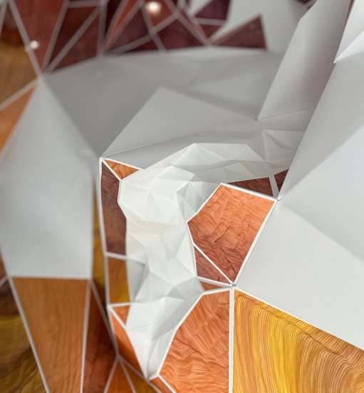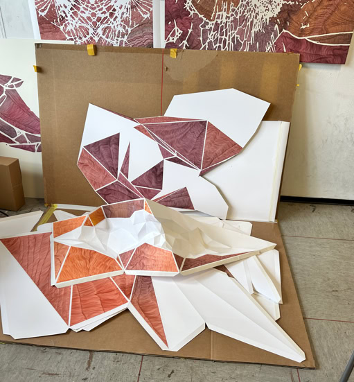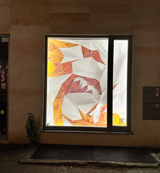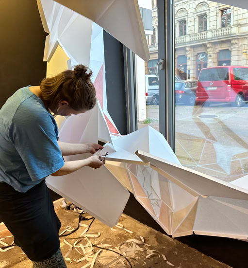 A sculptural arrangement of paper distortions developed for the project space 3W1F, which can be perceived from the outside via the shop window, is based on the shop window situation and at the same time deconstructs it through irregular outgrowths. Drawing fragments on parts of the paper installation create spatial illusions that take up the real construct and shift the different depths of the space.