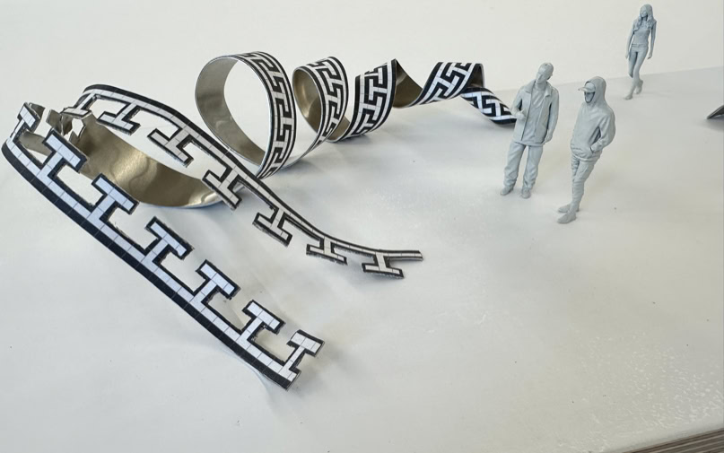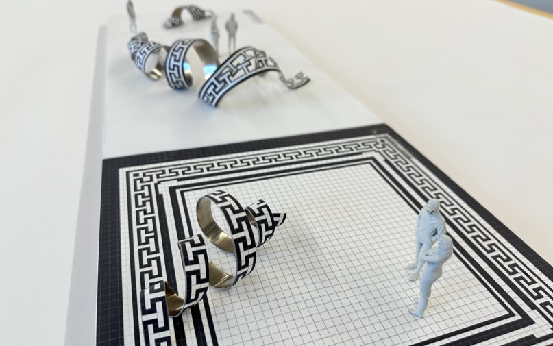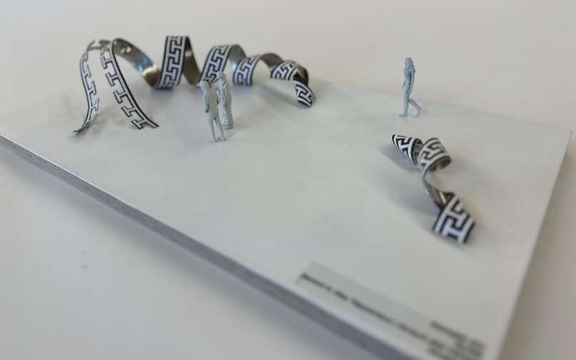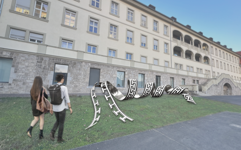 Vorraum alter Hörsaal Aus dem historischen Kachelboden erhebt sich ein Teil des umlaufenden Ornamentes. Es scheint sich zu verflüssigen und sein statisches Gefüge zu verlas- sen, um sich in einer geschwungen Spirale über den Boden zu kringeln. Das mit dem gleichen Muster versehene Band aus gebogenem Aluminiumblech stellt Bezüge zur historisch geprägten Architektur und bildhafte Zusammenhänge zu den gewundenen Formen von DNA-Strängen und anderen Proteinver- bindungen her. |