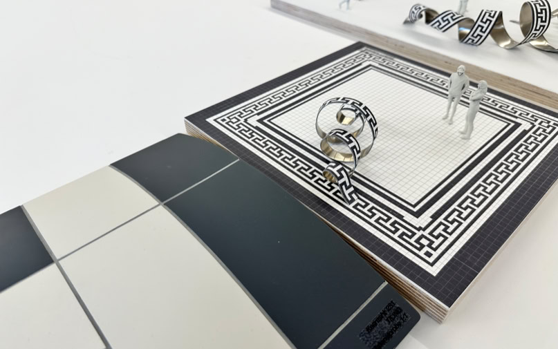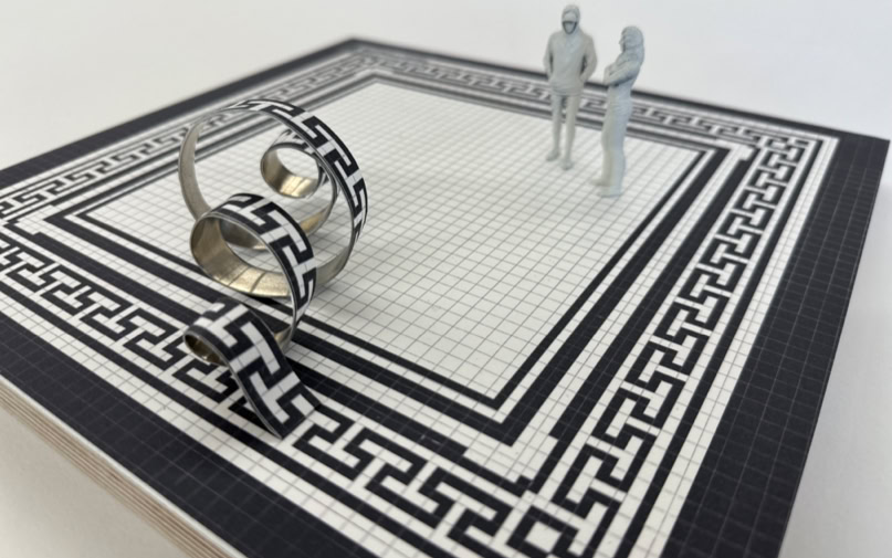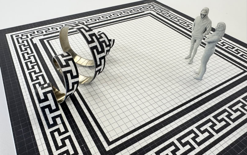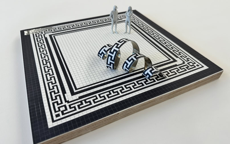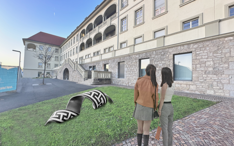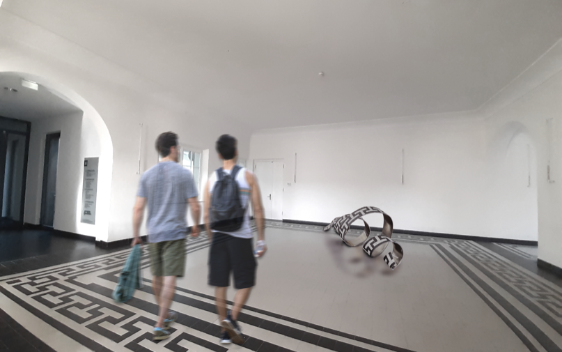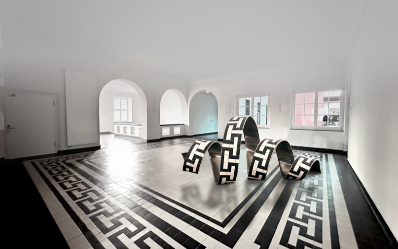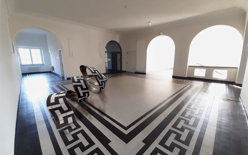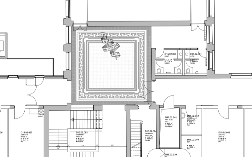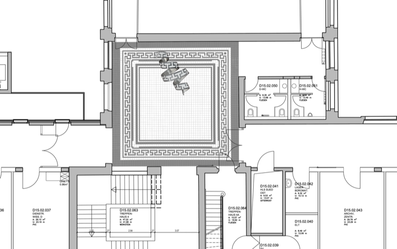 Anteroom of the old lecture hall Part of the surrounding ornament rises up from the historic tiled floor. It seems to liquefy and leave its static structure to curl in a sweeping spiral across the floor. The strip of bent aluminum sheet with the same pattern creates references to the historically influenced architecture and visual connections to the winding forms of DNA strands and other protein bonds.