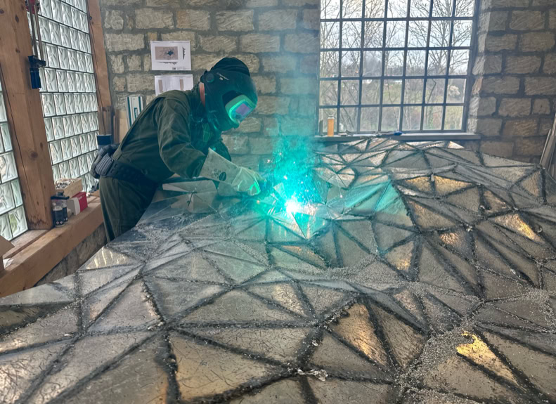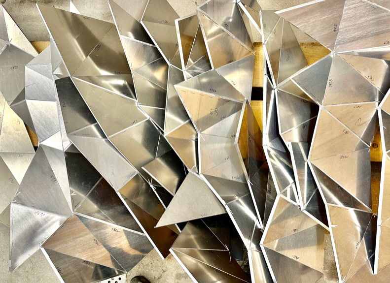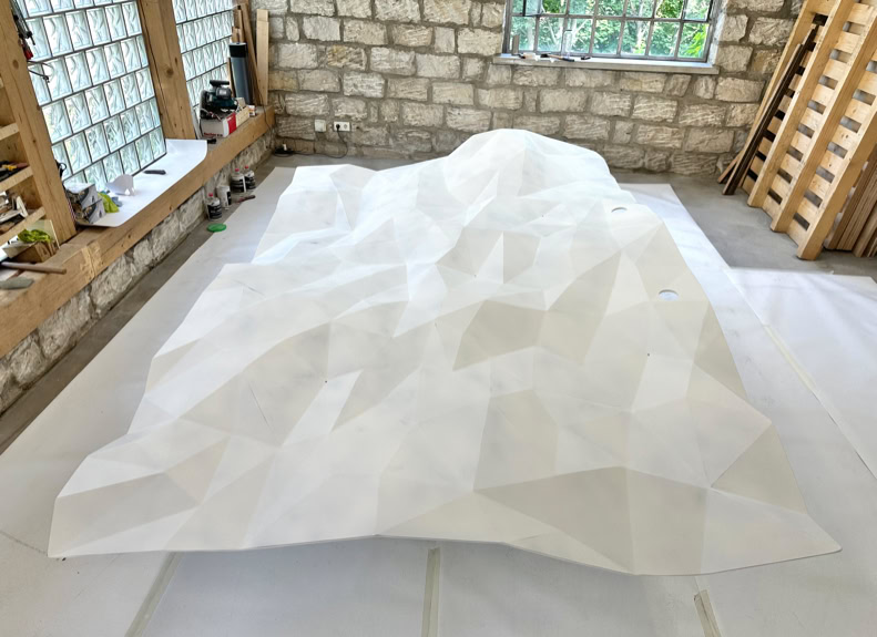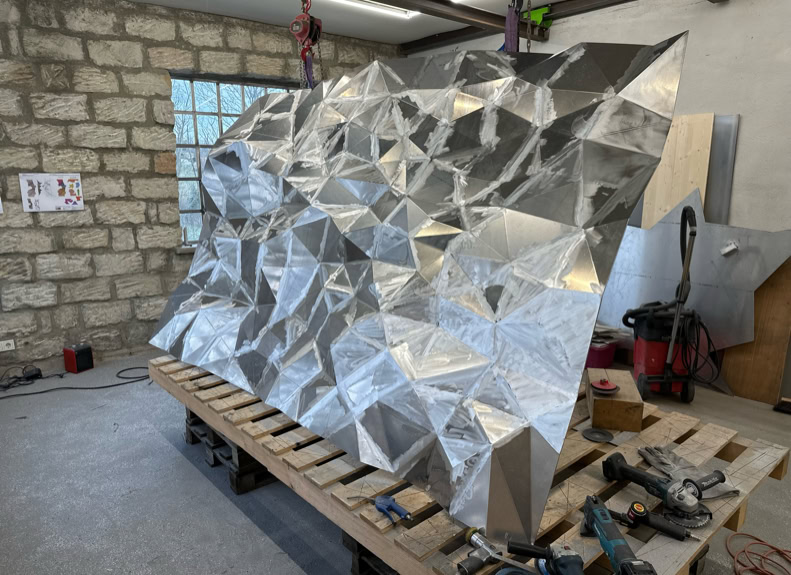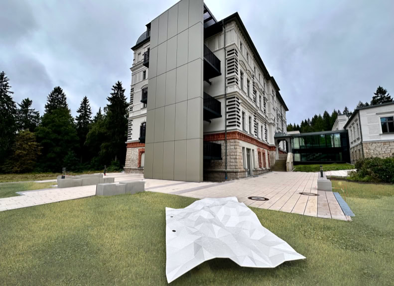 The triangular arrangements reproduce the surface movement of a particular landscape. In a reduced way, they form the topographical modelling of the surrounding mountains and thus establish a connection to the location of the educational centre and the adjacent forested area, which is strongly influenced by its geographical setting. With the poetic image of a floating leaf, the sculpture also refers to the transfer and transmission of information that takes place here.