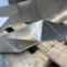 Ineinander verschachtelte Dreiecksformationen fügen sich zu einem zerklüfteten, gewölbten Rechteck zusammen, welches in seiner Grundform an ein zerknautschtes Blatt Papier erinnert. Zwei unauffällige kreisförmige Bohrungen am Rand der weiß lackieren Aluminiumskulptur deuten auf die Darstellung eines gelochten A4 Blattes und rufen das Bild einer, im Bildungsbetrieb laissez-faire auf Papier gebrachten und wieder verworfenen Aufzeichnung hervor.