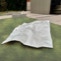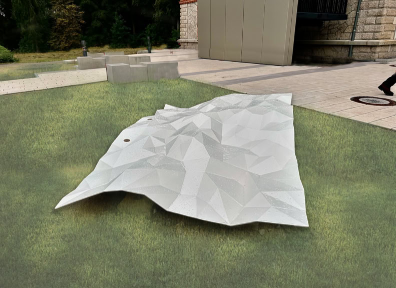 Interlocking triangular shapes combine to form a jagged, curving rectangle whose basic design is reminiscent of a crumpled sheet of paper. Two inconspicuous circular holes on the edge of the white lacquered aluminum sculpture suggest the representation of a perforated A4 sheet of paper and evoke the image of a record casually put down on paper and discarded again in an educational setting.