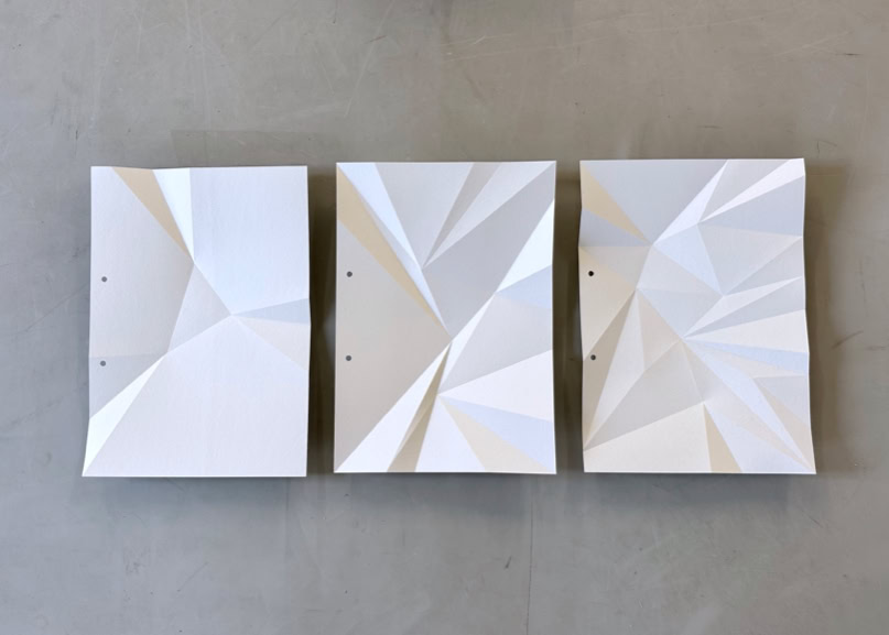 EINFALT and VIELFALT are the results of a previous experimental arrangement with a large number of folded A4 sheets, which become spatial objects with geometric and static properties through their folding. With each additional fold, the possibilities of the surfaces and edges spreading out in space increase.