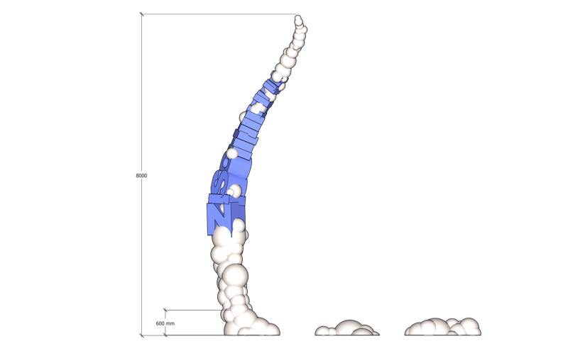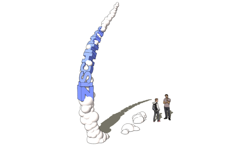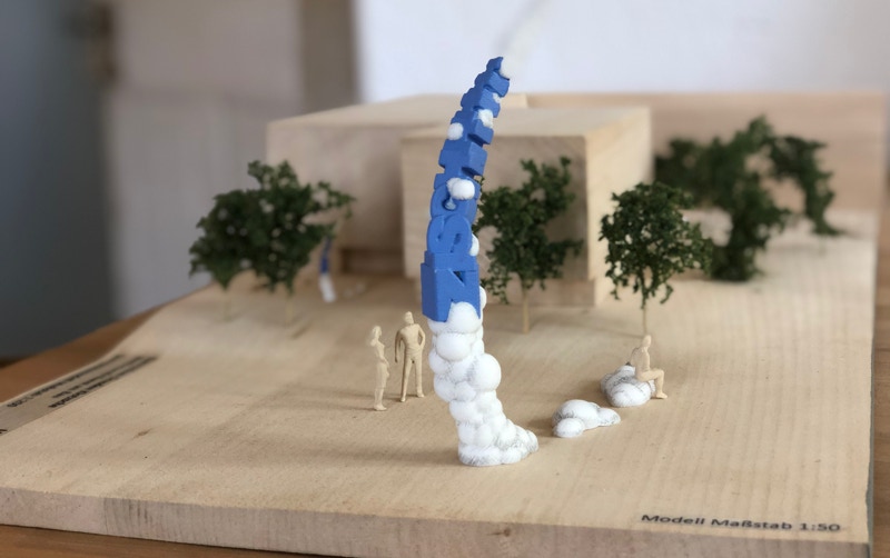 Bezugnehmend auf Abbildungen der Comic-Kultur, in denen durchstartende oder fliegende Superhelden, als Ausdruck ihrer Stärke und Geschwindigkeit einem Flugzeug gleich, mit einem Kondensstreifen ausgestattet werden, gibt der Entwurf mit den Titel ZISCH die räumliche Darstellung eines vergleichbaren Abhebeprozesses wieder.
